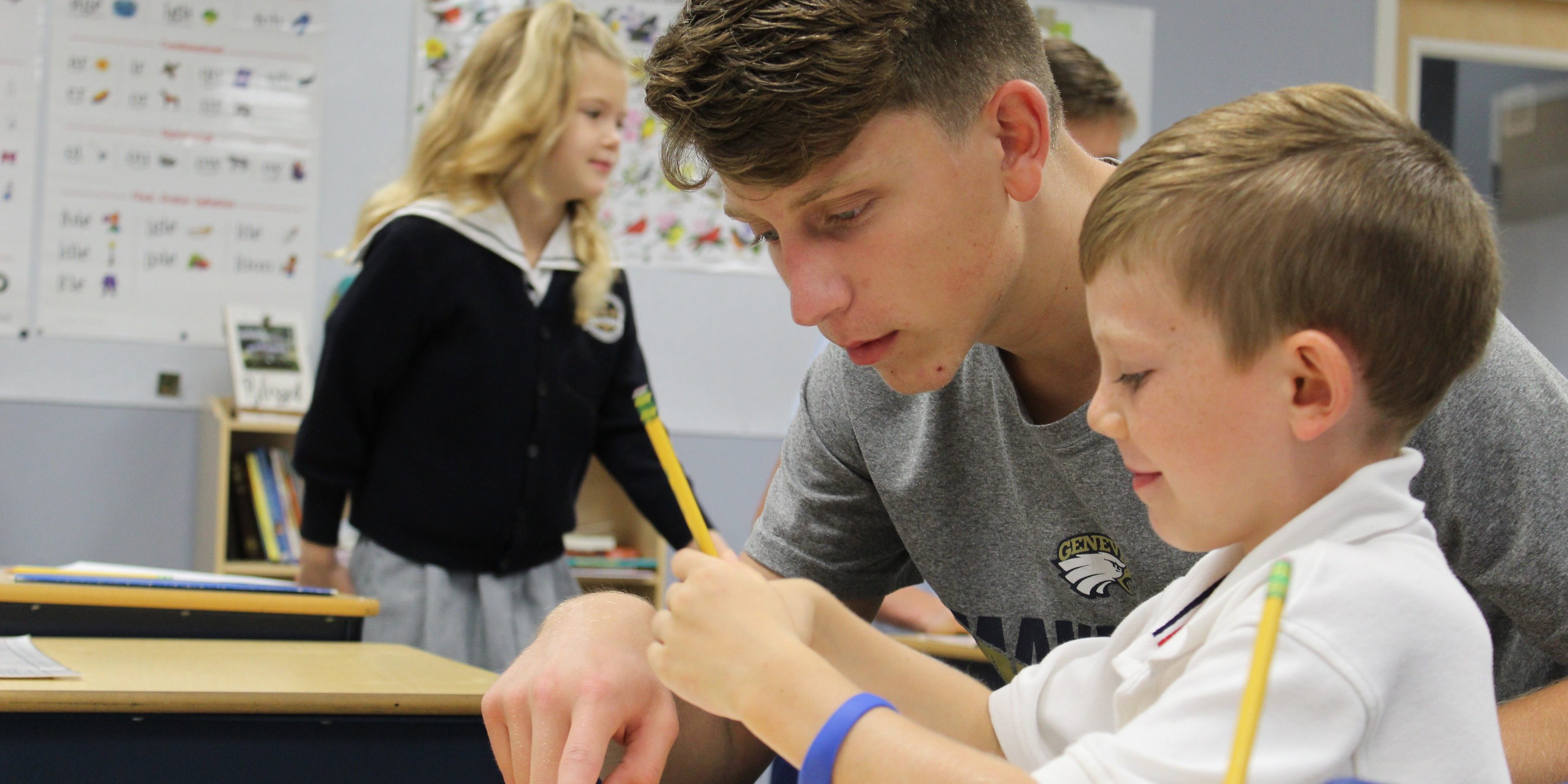 This program fosters relational connections on campus like the friendship formed between junior John Henry Friesenhahn and Justus Cloutier, Gage Boles and Cooper Green from Mrs. Lavezzari’s second grade class (shown here). The AIM Program is one of the many things that makes Geneva unique and builds a strong community.