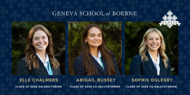 Geneva School of Boerne has named its 2026 Valedictorian and Co-Salutatorians. These graduating seniors will deliver addresses at the Geneva Commencement Exercises in May. Elle Chalmers, daughter of Rob and Stacy Chalmers, has earned the distinction as Geneva’s 2026 Valedictorian. Elle has served as President of NHS, President of FCA and President of Geneva’s GENMED…