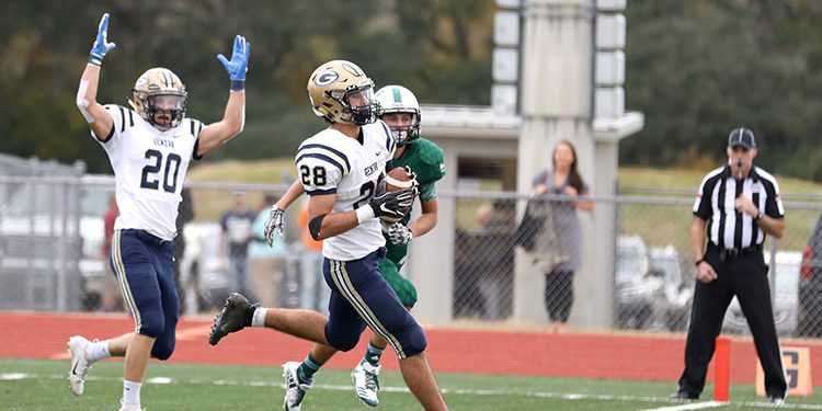 Senior running back Devon Ahrens (28) is shown above as he scores one of his four touchdowns as teammate Easton Myrick (20) celebrates in the Eagles’ 47-19 victory over The Woodlands Christian Academy.