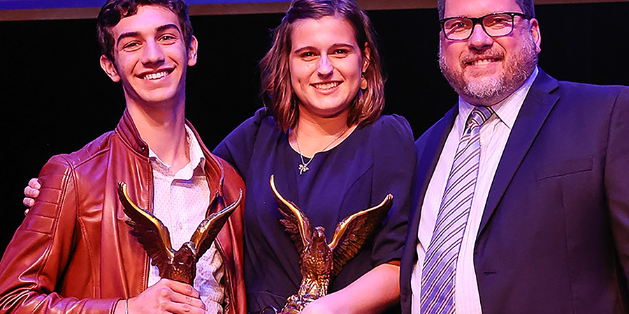 Geneva School of Boerne recognizes the most outstanding high school students each school year. The Aquila Award recognizes the male and female student who best represent the goals and ideals of Geneva School. Seniors Nicolas Siller (left) and Anna Beth Muck (center) were selected by the Rhetoric School faculty and given the esteemed Aquila Award (“Aquila” is Latin for “eagle”). An eagle statuette was given to these students at the Closing Assembly by Headmaster Dirk Russell and their names are recorded on perpetual plaques in the administration building. The Aquila Award is the Rhetoric School’s highest honor.
