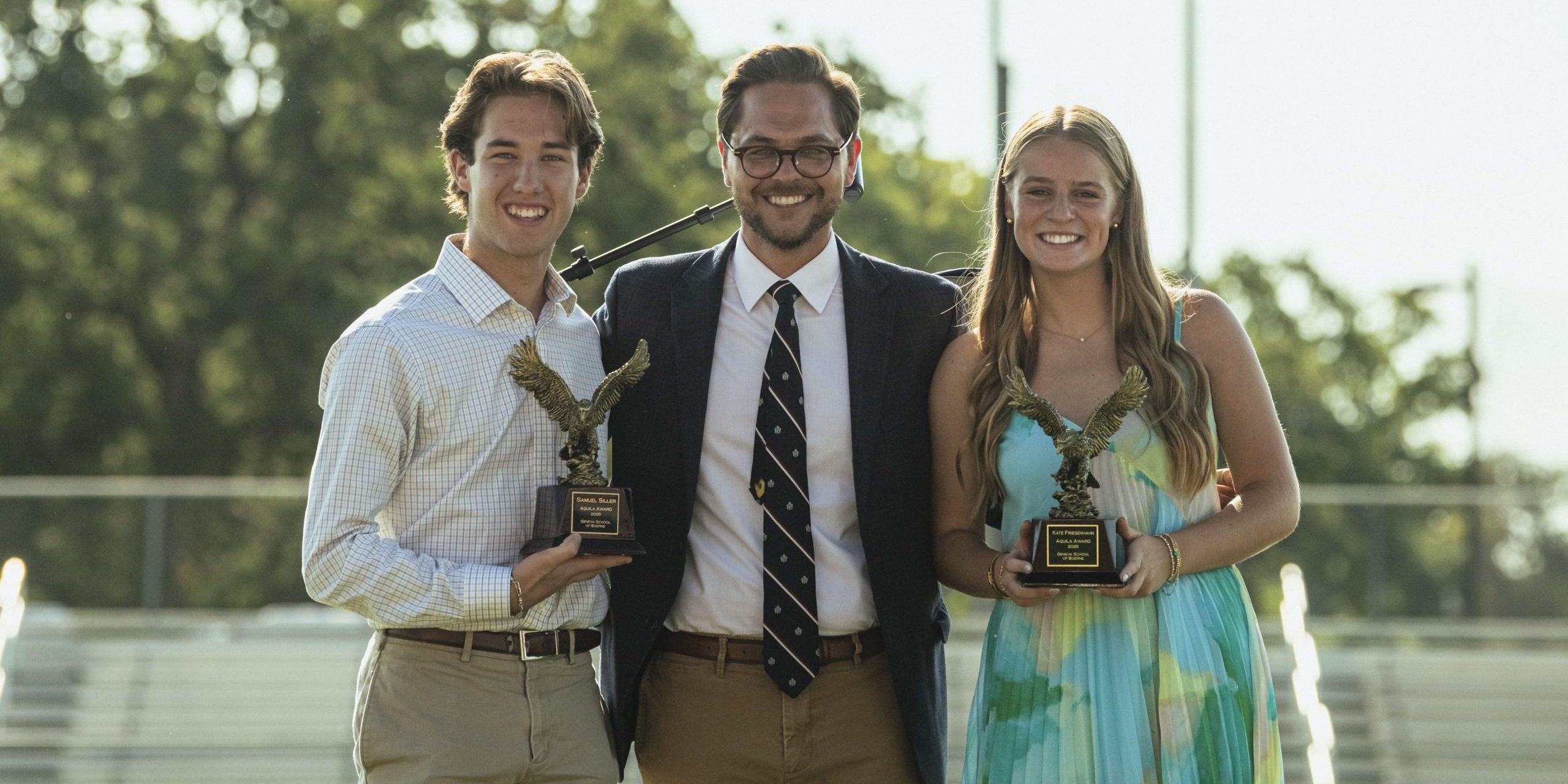 Geneva School of Boerne recognizes the most outstanding high school students each school year. The Aquila Award recognizes the male and female student who best represent the goals and ideals of Geneva School. Seniors Kate Friesenhahn and Samuel Siller were selected by the Rhetoric School faculty and given the esteemed Aquila Award (“Aquila” is Latin for “eagle”). An eagle statuette was given to these students at the Closing Assembly by Rhetoric School Headmaster Matt Donnowitz and their names are recorded on perpetual plaques in the administration building. The Aquila Award is the Rhetoric School’s highest honor.