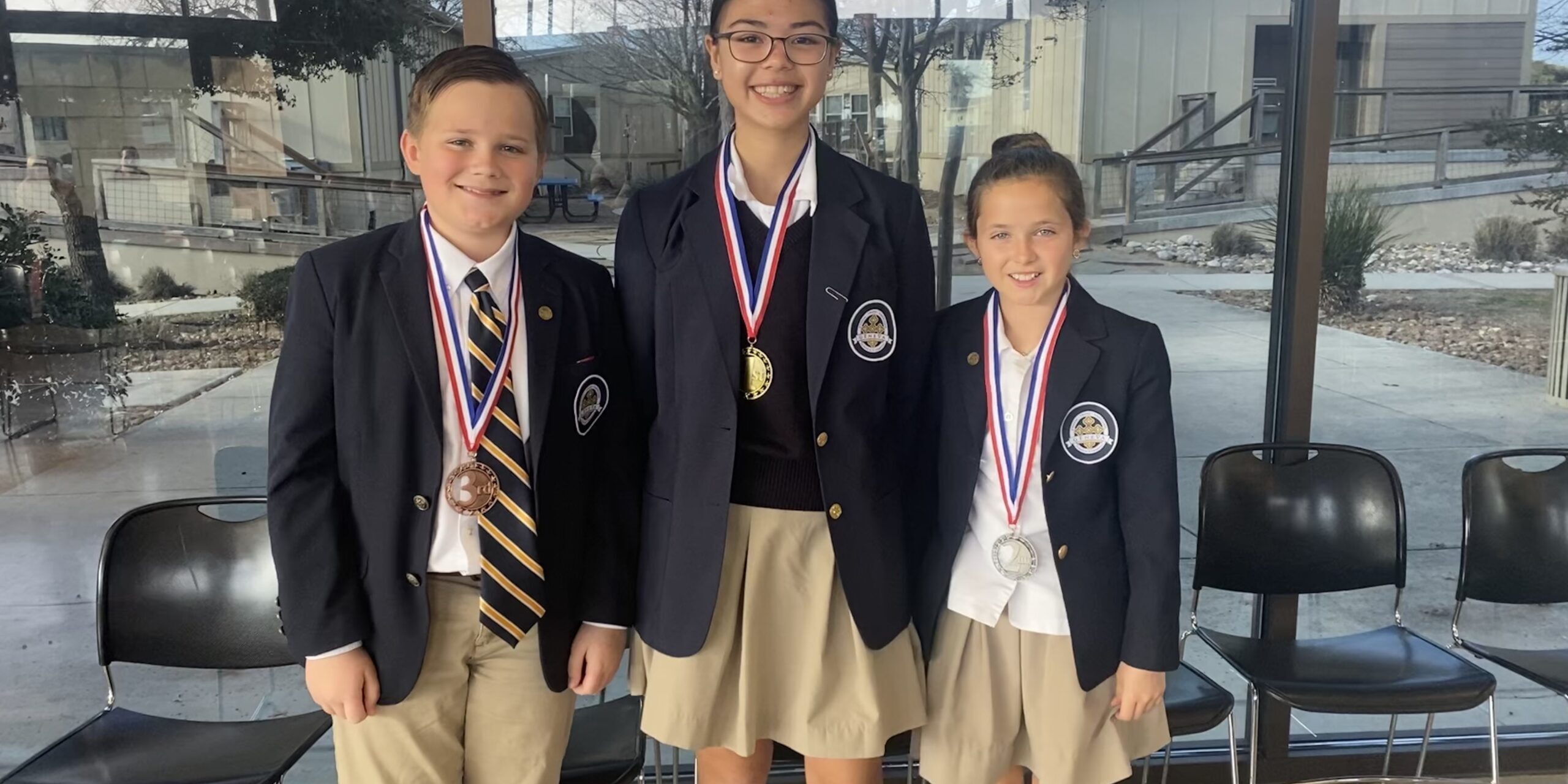 Geneva School of Boerne held its annual Spelling Bee for students in sixth through eighth grades recently. Eighth-grader Zoe Briggs (shown center) was crowned the 2023 Geneva Logic School Spelling Bee Champion. Sixth-grader Peyton Eiland (shown right) finished as runner-up and Myron Barrow (shown left) earned third place.