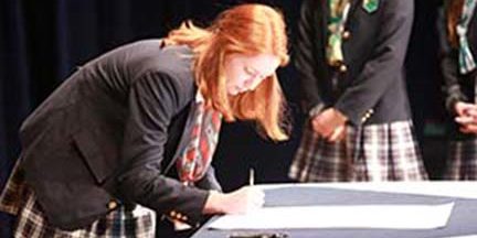 The students selected by their peers and unanimously approved by the faculty to serve as members of the Geneva Honor Council are seniors William Cone, Haley Hallmark and Nathan Young. Junior representatives are Jack Cupit and Corley Petrie. Sophomore Katherine Lacy and freshman Sydney Griffey are non-voting members of the council. Freshman Lily Langenbahn is shown here signing the Geneva Honor Code at the annual assembly on September 10.