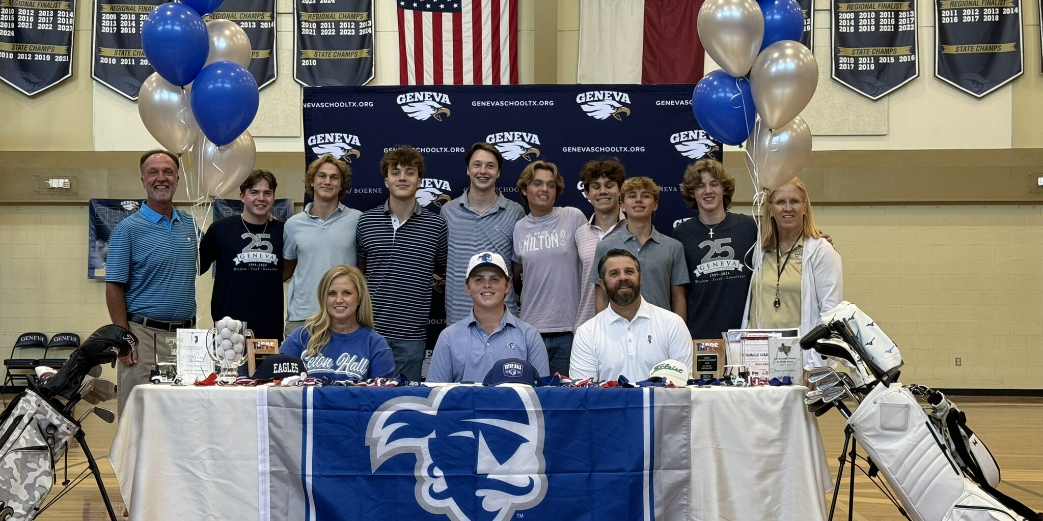 Geneva School of Boerne is proud to announce that Jace Hulett signed to compete at the collegiate level on Wednesday, November 13, surrounded by his parents, coaches, teammates and friends at a signing celebration in the Geneva Competition Gym as he made his commitment official. Hulett signed with the golf team at Seton Hall University.