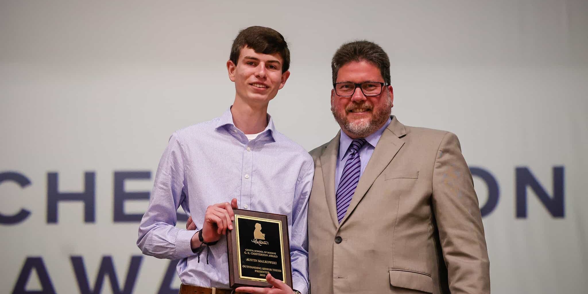 This year, the 55 seniors presented and defended their theses and Austin Malkowski (above), son of Jessica and Richard Malkowski of Boerne, was recognized as the 2023 winner of the G.K. Chesterton Award for the best overall senior thesis presentation for her thesis titled, “America’s Power Trip: The Mistreatment of American Drug Addiction.” Other G.K. Chesterton Finalists were Mattie Sue Arnold, Ava Ayers, Abby Bower, Sloane Burkholder, Avery Eggerss, Claire Erfurt, Juliana Flores, Hailey Hubenak, Austin Malkowski, Elle Nicholson, George Viña and Mia Wilson.