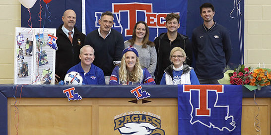 Geneva senior Katelyn Davis signed to play NCAA Division I soccer at Louisiana Tech University on National Signing Day. Katelyn committed her junior year to play for Louisiana Tech and was surrounded by family and friends as she made it official on Wednesday, November 14 in the Geneva Gym. Front row: Katelyn with her parents Bryan and Jane Ellen Davis. Back row: Geneva Rhetoric School Headmaster Rob Shelton, Coach Marty Morris, Coach Becky Doran, SA Beast Trainer Sean Arters and Geneva AD Eric Boerboom.