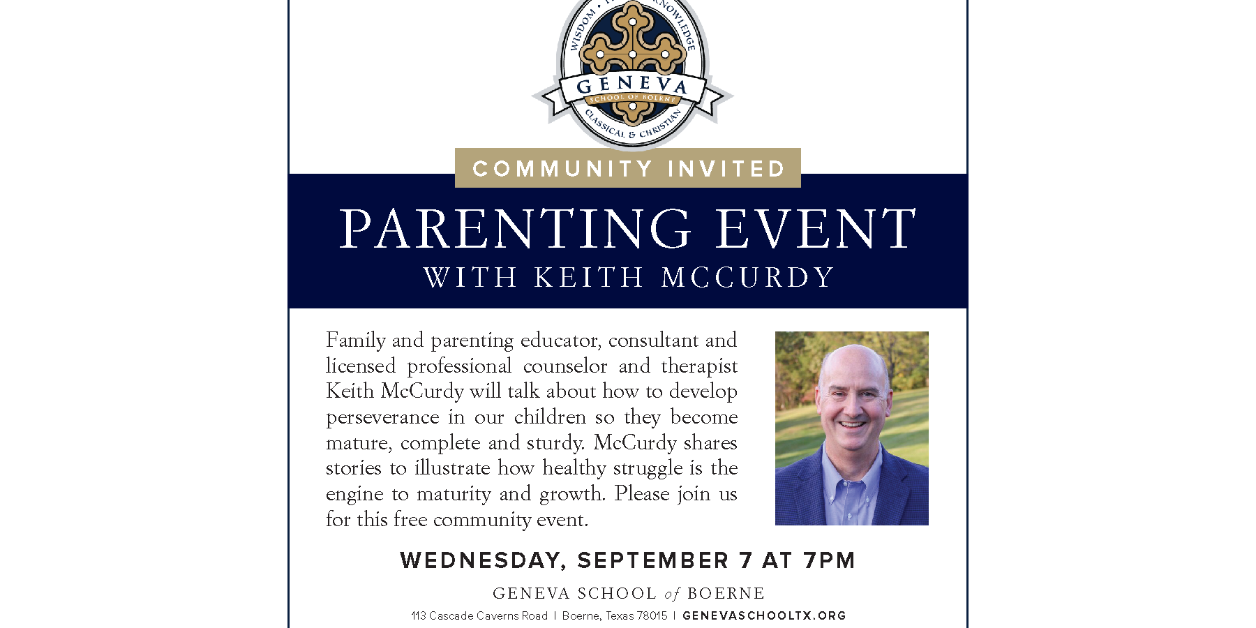 Wednesday, September 7, Geneva will host family and parenting educator, consultant and licensed professional counselor and therapist Keith McCurdy to speak about developing perseverance in our children. Please join us for this free community event.